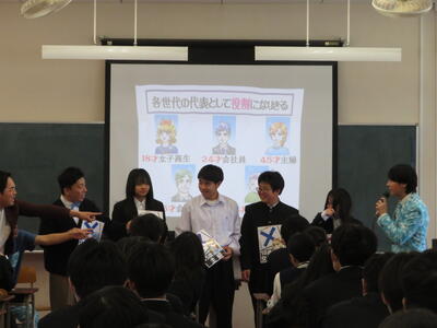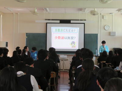 4月16日(木)の3、4限で3学年を対象に主権者教育が行われました。今年のゲストは、お笑い芸人の流れ星☆さんエイトブリッジさんでした。役割を決めて体験活動することで面白く、分かりやすく選挙や政治について学び、身近に感じることができました。